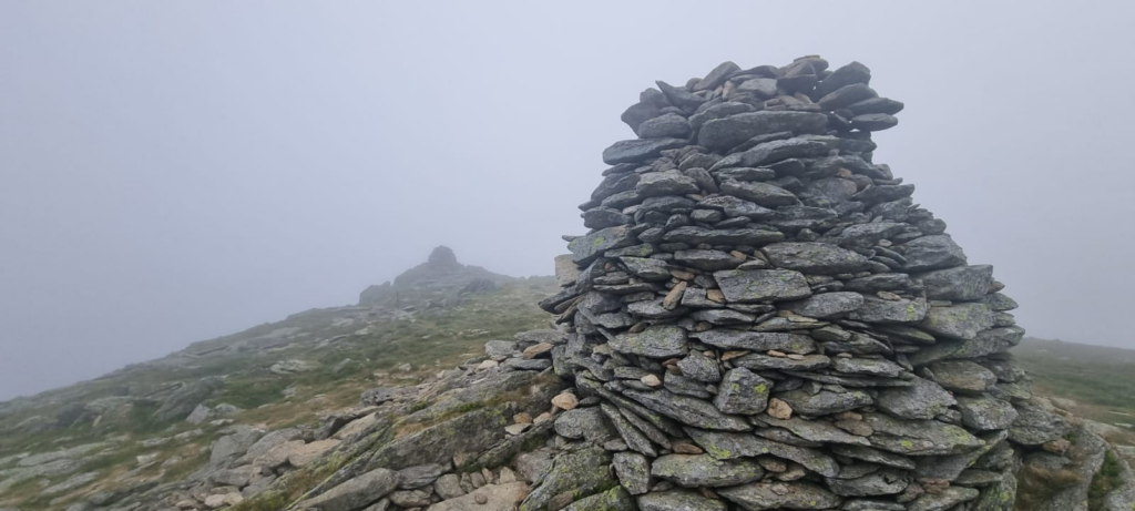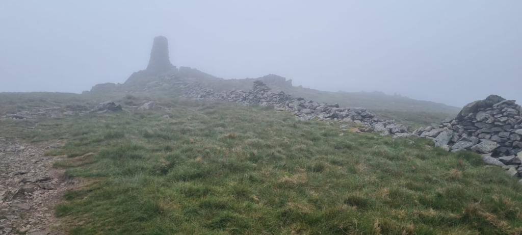 The cloud was getting thicker at this point, and the wind was making my hands very cold (I did not think to pack gloves for a June hike!). Eventually around 8:20am, the large obelisk at Thornthwaite Crag loomed out of the mist.