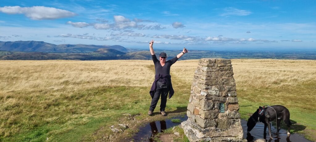 Sarah’s summit pose at Loadpot Hill, looking towards Little Mell and Great Mell