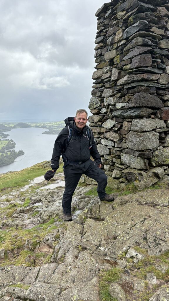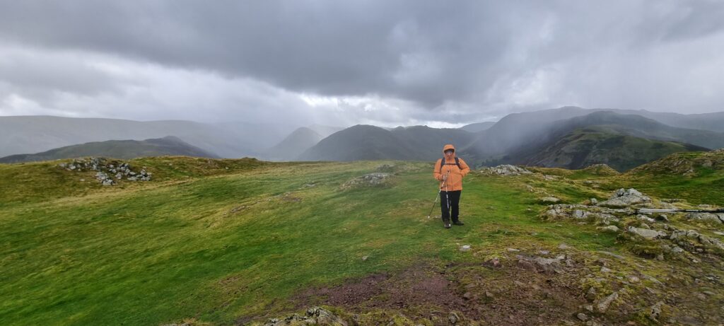 It let up briefly for summit photos, and the surrounding landscape looked very dramatic – very different to the blue skies a year ago.